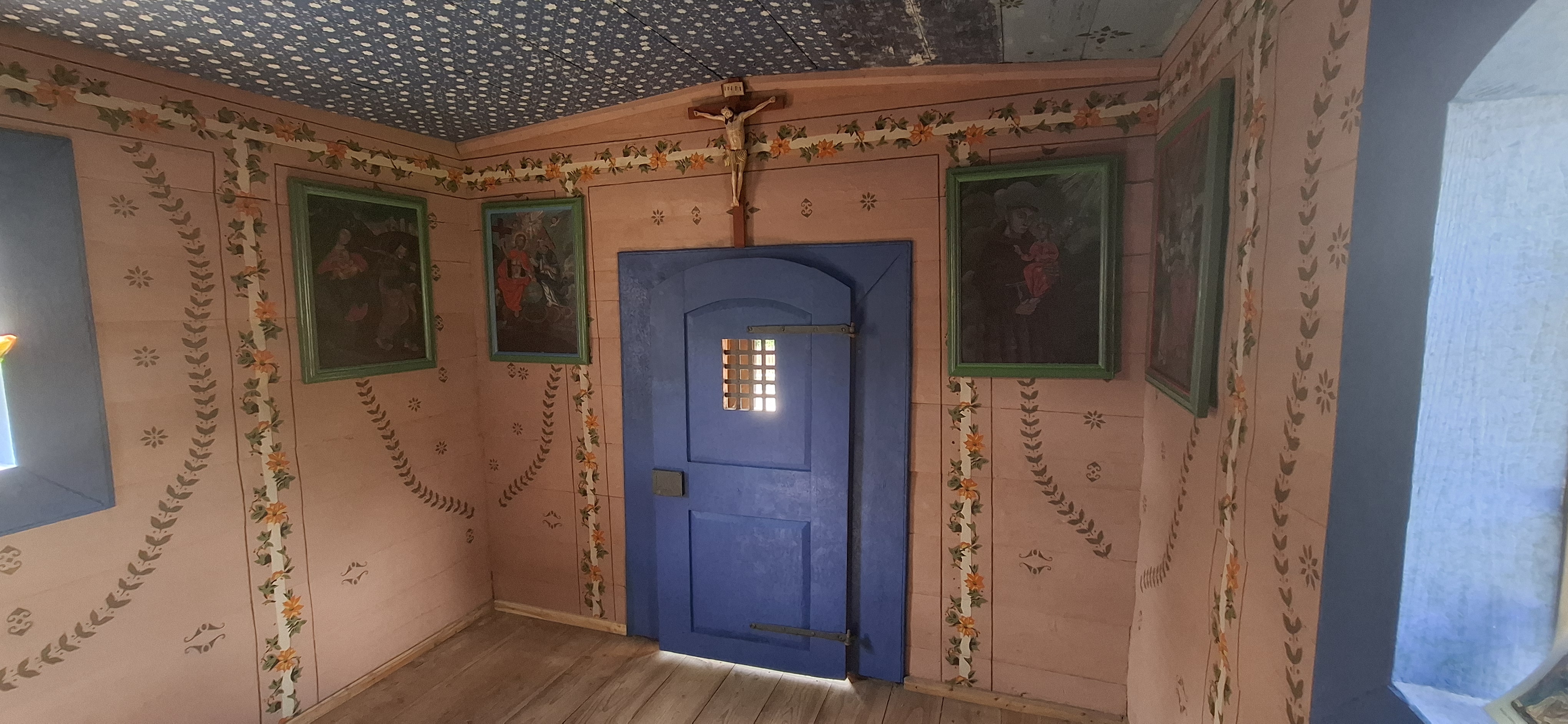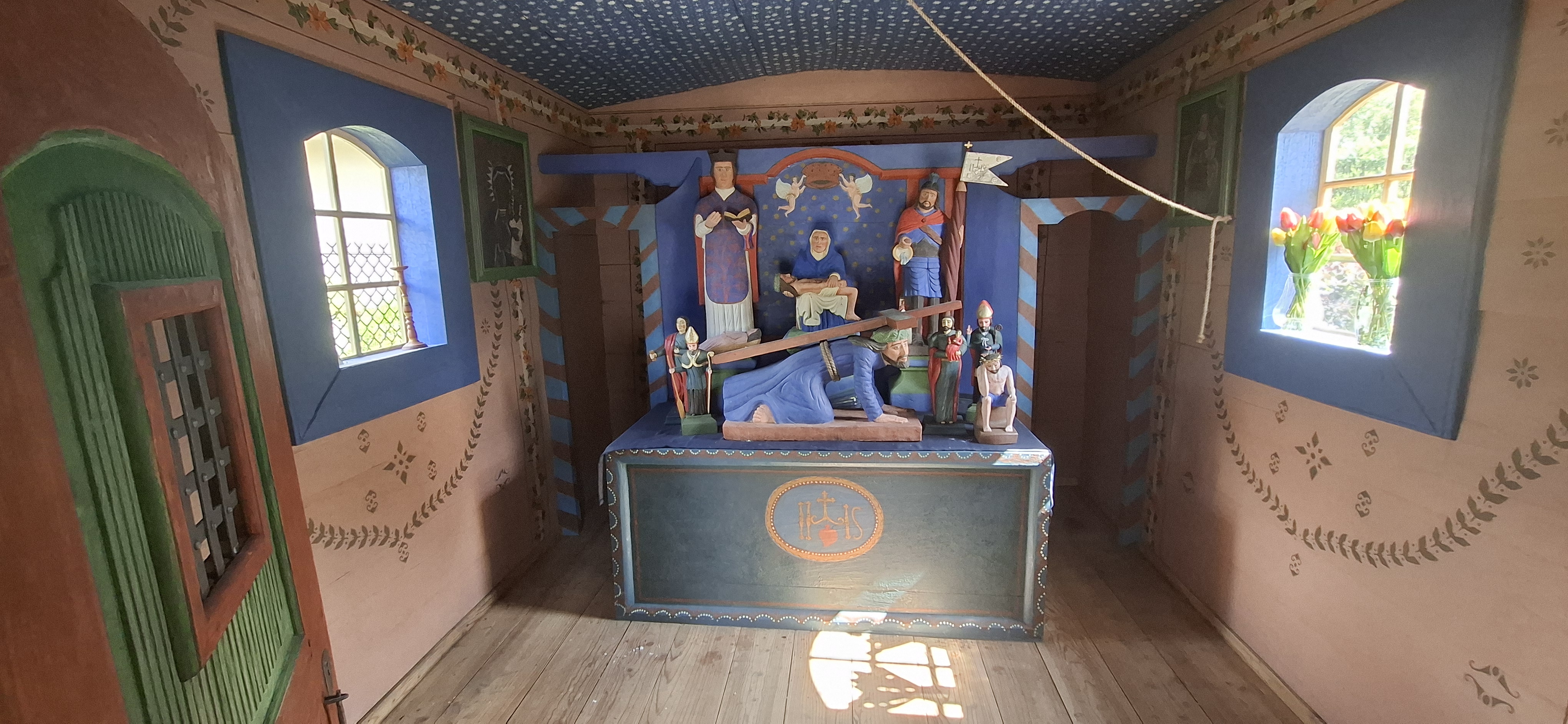Prace we wnętrzu kapliczki rozpoczęto od przetransportowania jego wyposażenia do pracowni konserwatorskiej, w której przeprowadzono pełną konserwację techniczną i estetyczną zachowanego ołtarzyka wraz z drewnianymi rzeźbami przedstawiającymi postać Chrystusa Frasobliwego, Św. Stanisława i Św. Wojciecha. Wykonane badania stratygraficzne wykazały istnienie trzech polichromii, w których najstarsza z nich została odsłonięta i poddana zabiegom polegającym na jej odnowieniu i częściowym zrekonstruowaniu. Z podobną sytuacją mieliśmy do czynienia na powierzchni drewnianego stropu, gdzie występowały bogate zdobienia, oparte na motywie gwiazdek i krzyżyków malowanych na błękicie. Polichromię zachowaną na powierzchni ścian poddano konserwacji i częściowej rekonstrukcji. Badania na obecność wcześniejszych polichromii w tych częściach kapliczki wykazała ich istnienie, lecz ich śladowa ilość oraz brak dokumentów archiwalnych uniemożliwiała ich odtworzenie.